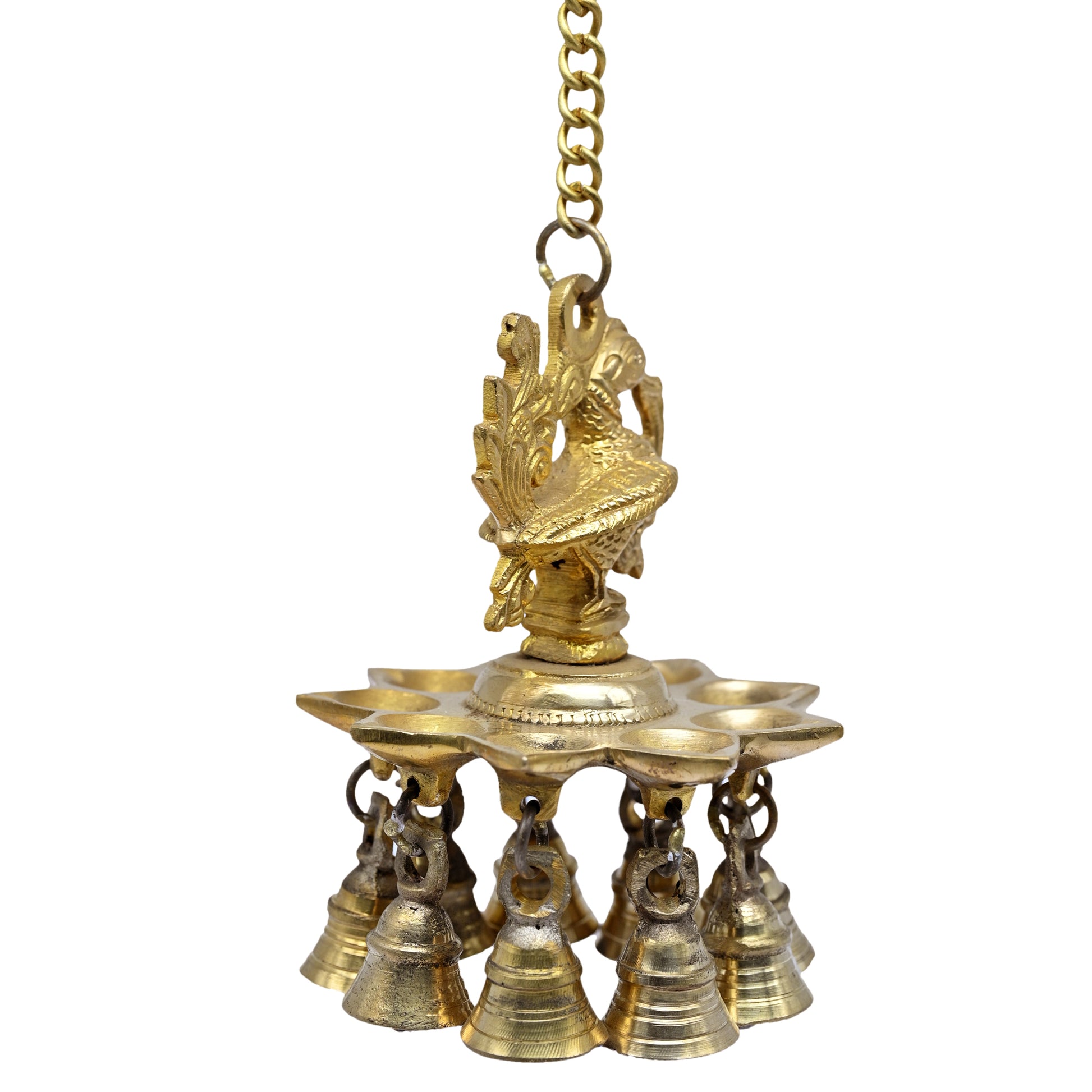 A Hanging Peacock 9 Diya is a traditional brass oil lamp featuring a peacock motif and typically nine diya (oil wick) holders, designed to be suspended from a chain for pooja rooms or festive decor. These pieces are handmade from high-quality brass, renowned for their auspicious symbolism, lustrous antique finish, and intricate detailing.