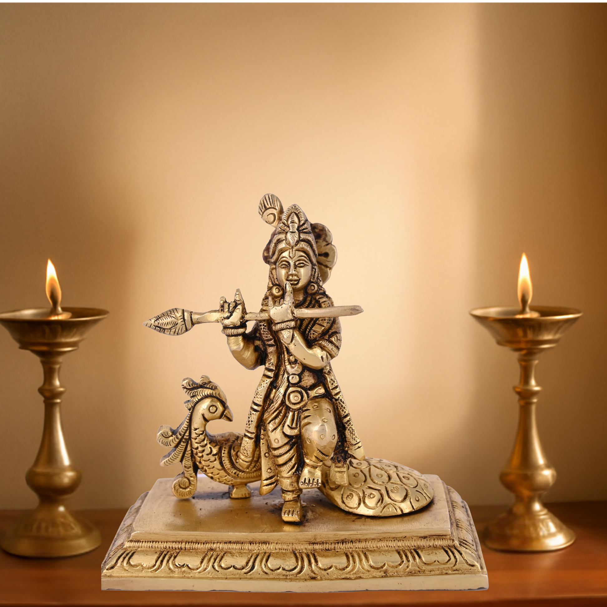 Design: Intricately detailed sculpture showing Krishna in traditional attire, flute in hand, with a finely crafted peacock by his side, symbolizing grace and divine connection